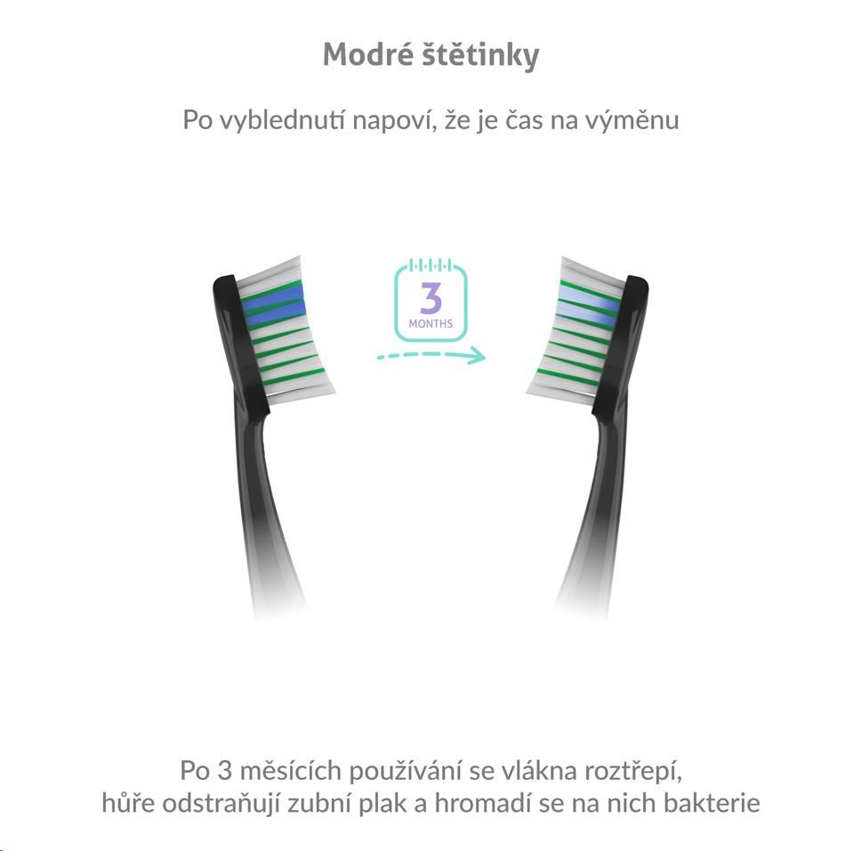 Hlavice vydrží až 3 měsíce používání, poté se začnou třepit, ztrácí účinnost a navíc se na nich hromadí bakterie. Naštěstí jsou hlavice opatřeny modrými štětinami, které po 3 měsících vyblednou a vy tak víte, že je načase hlavice vyměnit.