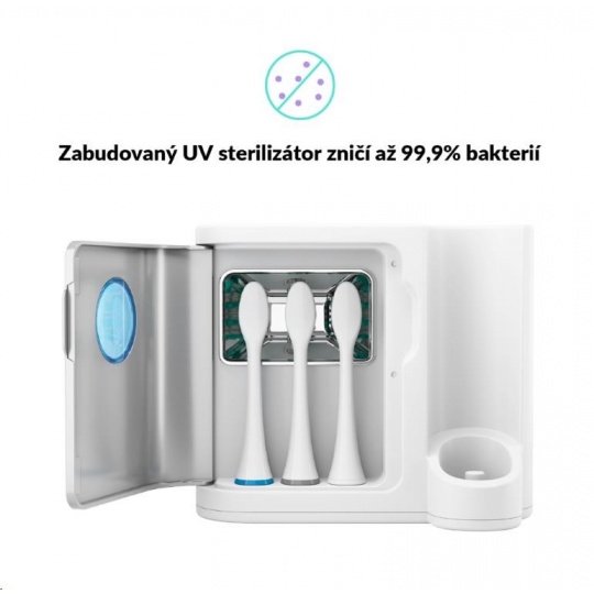 UV světlo během chvíle dezinfikuje hlavu kartáčku a zničí až 99,9 % bakterií – čistá ústa začínají čistým kartáčkem.