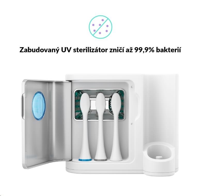 UV světlo během chvíle dezinfikuje hlavu kartáčku a zničí až 99,9 % bakterií – čistá ústa začínají čistým kartáčkem.
