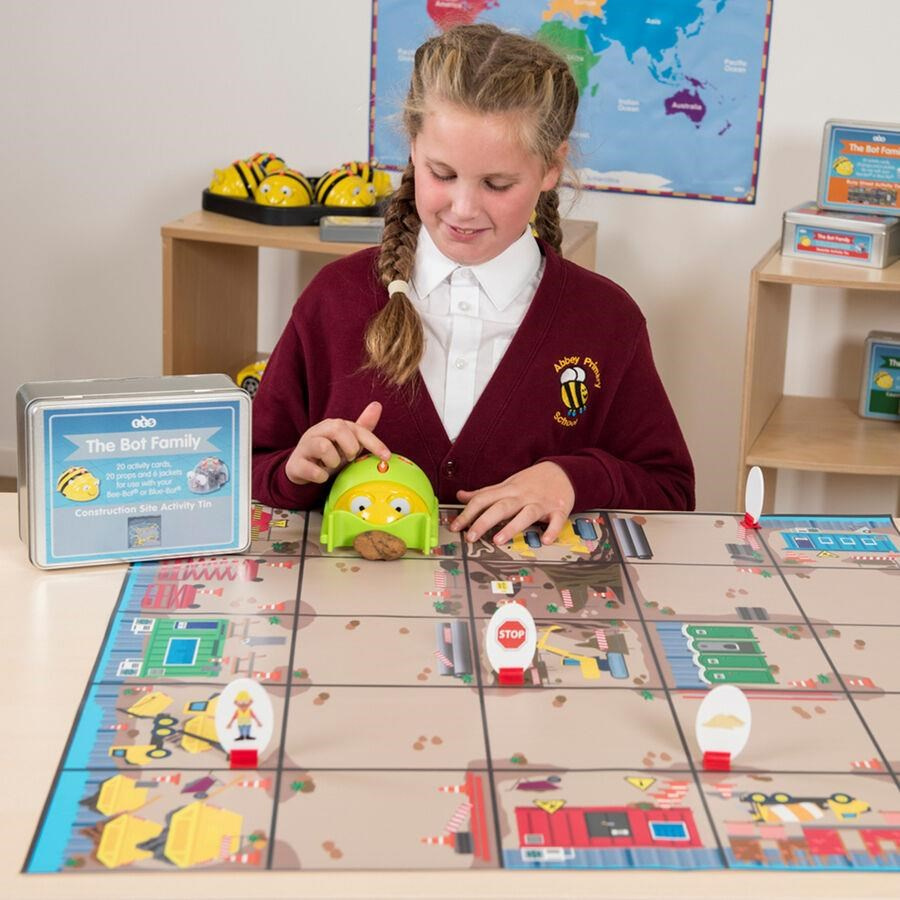 Bee-Bot podložka Stavba je poutavý vzdělávací zdroj, který kombinuje zábavu se základními vzdělávacími koncepty v programování a zeměpisu. Děti mohou nasměrovat Bee-Bota přes různé terény podrobně popsané na podložce a řešit úkoly, které zlepší jejich porozumění základnímu programování.