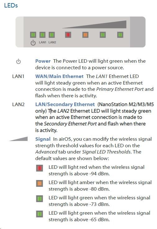 Nanostation M5 disponuje proti verzi "locoM5" dvěma ethernet.porty a výkonnější anténou se ziskem 16dBi. Můžeme tak k jednotce například připojit IP kameru. Díky možnosti distribuce PoE napájení i na tento port není nutné instalovat dva samostatné PoE adaptéry. PoE na druhém portu lze softwarově vypínat/zapínat, lze tak případně vzdáleně restartovat připojené zařízení. PoE adaptér disponuje "RESET" tlačítkem pro uvedení jednotky do továrního nastavení případně TFTP režimu pro obnovu poškozeného firmware.