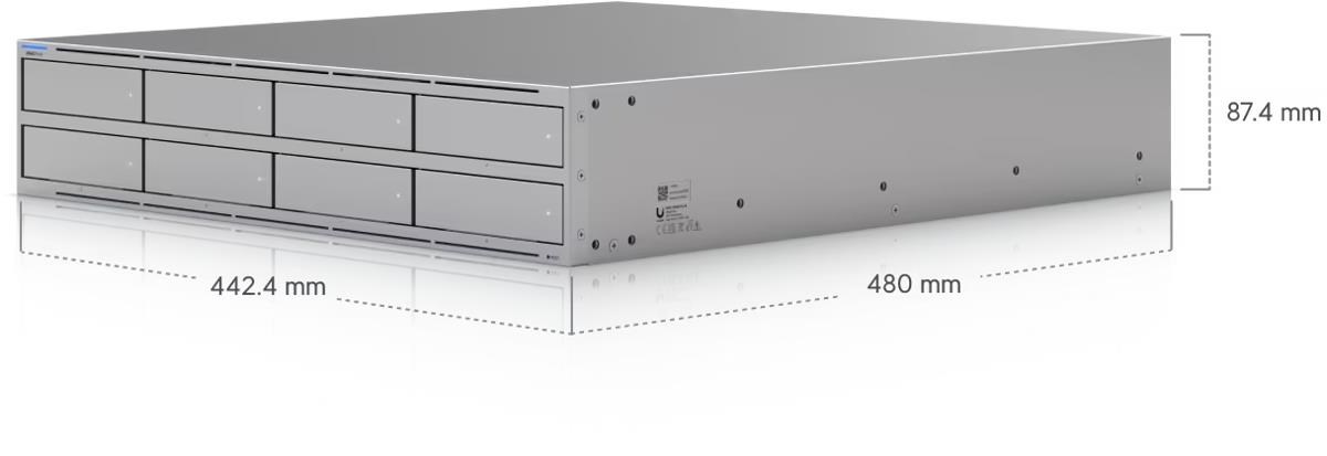 Popis produktu Síťové úložiště UniFi velikosti 2U pro montáž do racku s (8) pozicemi pro 2,5/3,5" pevné disky, (2) sloty pro M.2 NVMe SSD cache, (1) 10 GbE RJ-45 portem a (2) 10G SFP+ porty pro uplink. Poháněn je čtyřjádrovým procesorem ARM Cortex-A57, který je doplněný o 16 GB operační paměti. Disponuje dvěmi redundantními napájecími moduly s možností výměny za provozu. Obsah balení • Zařízení • Napájecí kabel a zdroj • Příslušenství pro montáž do racku Technické parametry Konektory a rozhraní Počet slotů pro HDD:8 Počet M.2 slotů:2 Rychlost LAN:(1) 100M/1G/2.5G/5G/10G Gigabit LAN:Ano Optické rozhraní:(2) 10Gbps Ostatní:Bluetooth Napájení Typ napájení:Ze sítě (230V) Redundantní napájení:Ano Max. spotřeba energie [W]:250 Napájení přes konektor/svorkovnici:230V AC Fyzické charakteristiky Provedení:Rackmount Materiál:Ocel Počet "U" pozic:2 LED indikace:Ano Provozní teplota [°C]:-5 až 40 Hmotnost [kg]:11,5 Šířka [mm]:442 Výška [mm]:87 Hloubka [mm]:480 Hardware Velikost operační paměti [GB]:16 CPU:ARM Cortex-A57.