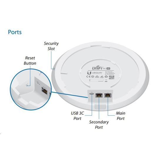 UniFi AP AC HD je první 802.11ac wave2 AP od Ubiquiti s celkovou propustností až 2533Mbps (2.4GHz 800Mbps + 5GHz 1733Mbps), Disponuje 4x4 MU-MIMO všesměrovými dvou-polarizačními dualband. 3dBi antény pro 2.4GHz a 4dBi pro 5GHz s výkonem rádiové části až 25dBm jak pro 2.4 tak i pro 5GHz současně. Podporuje standardy 802.11a/b/g/n/ac/ac wave2, disponuje dvěma gigabit.ethernet. porty (druhý je v bridgi). Lze napájet prostřednictvím aktnivního PoE dle 802.3at případně pasivního (48V DC), PoE adaptér je součástí balení (pasivní). Maximální spotřeba činní 17W.