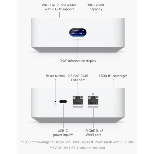 Popis produktu UniFi Express 7 je superkompaktní 10 gigabitová UniFi Cloud Gateway s integrovaným WiFi 7 AP. Pro připojení k síti je vybavena (1) 10Gbps WAN portem a (1) 2.5Gbps LAN portem. Vestavěný Tri-band WiFi 7 AP podporuje nejnovější standard 802.11be s modulační rychlostí až 5,7Gbps v pásmu 6GHz, 4,3Gbps v pásmu 5GHz a 688Mbps v pásmu 2,4GHz s pokročilým šifrováním WPA3. Díky předinstalované aplikaci UniFi Network umožňuje router správu až 30 UniFi zařízení. Kompaktní, ale výkonné provedení zařízení zajišťuje propustnost až 2,3Gbps při aktivním IDS/IPS. Router také podporuje různé typy VPN, včetně site-to-site VPN. Napájení je řešeno přes USB-C 5V/5A, napájecí adaptér je součástí balení. Klíčové vlastnosti • Superkompaktní provedení • Vysoký výkon - propustnost až 2,3Gbps s podporou IDS/IPS • 10G WAN + 2.5G LAN • Vestavěné Tri-band WiFi 7 AP • UniFi Network pro správu až 30 UniFi zařízení • Podpora VPN, včetně site-to-site VPN Obsah balení • Zařízení • Napájecí adaptér • Napájecí kabel • Patch kabel Technické parametry Bezdrátové vlastnosti Bezdrátové frekvence:2.4 + 5 + 6 GHz (triple band) WiFi standardy:802.11n, 802.11a, 802.11ac, 802.11b/g, 802.11ax, 802.11be MU-MIMO:Ano Přenosová rychlost - 5GHz [Mb/s]:4300 Přenosová rychlost - 2.4GHz [Mb/s]:688 Přenosová rychlost - 6GHz [Mb/s]:5700 Vysílací výkon 2.4GHz [dBm]:23 Vysílací výkon 5GHz [dBm]:26 Vysílací výkon 6GHz [dBm]:24 Šifrování:WPA, WPA2, WPA3 2.4GHz MIMO:2 x 2 5GHz MIMO:2 x 2 6GHz MIMO:2 x 2 Typ antény:Vestavěná Roaming:Ano Zisk antény [dBi]:6, 7, 4 Konektory a rozhraní Rychlosti WAN:(1) 100M/1G/2.5G/5G/10G Rychlost LAN:(1) 100/1000/2500Mbps Gigabit LAN:Ano Ostatní:LCD displej Napájení Typ napájení:USB-C Max. spotřeba energie [W]:22 Napájení přes konektor/svorkovnici:5V / 5A Fyzické charakteristiky Provedení:Desktop Použití:Vnitřní Šasi:Plastové Tlačítka:Reset Provozní teplota [°C]:-10 až 40 Hmotnost [g]:422 Šířka [mm]:117 Výška [mm]:43 Hloubka [mm]:117 Hardware CPU:ARM Cortex-A53 Frekvence CPU [MHz]:1500 Počet CPU jader:4 RAM [MB]:3072 Software Podporované VPN:L2TP, IPSec, OpenVPN, WireGuard Předinstalovaný kontroller:UniFi Network Operační mód:AP Router Management:UniFi Network Podpora IPv6:Ano.