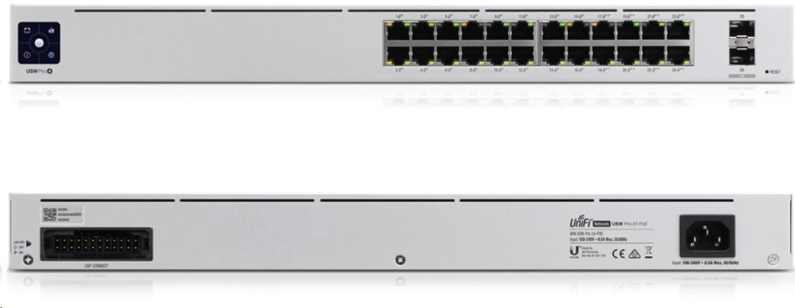 Jako Uplink poslouží dvojice portů 10G SFP+ se zpětnou kompatibilitou 1G SFP. Pro případ výpadku napájení nebo poruchy interního zdroje je možné switch připojit k záložnímu systému UniFi SmartPower, který obslouží až 6 podporovaných zařízení.