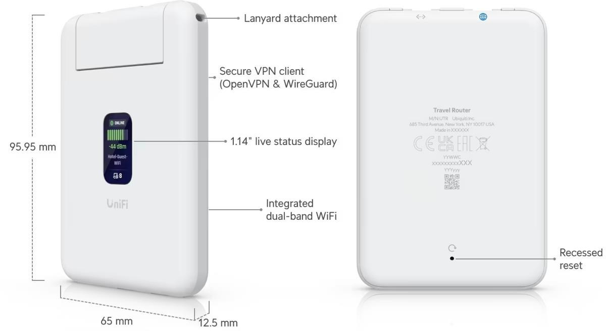 Popis produktu Ubiquiti UniFi Travel Router je ultra-kompaktní cestovní dual-band Wi-Fi 5 router pracující současně v pásmech 2,4GHz a 5GHz pro dosažení maximální propustnosti až 1,17Gbps, který je dále vybaven (2) 1Gbit porty a intuitivním displejem. Router může sdílet mobilní data z telefonu nebo proměnit veřejnou Wi-Fi síť na soukromou. Díky funkci Teleport lze snadno vytvořit zabezpečený VPN tunel zpět do vaší UniFi sítě odkudkoliv. Klíčové vlastnosti • (2) 1Gbit porty (1x LAN, 1x LAN/WAN) a dual-band Wi-Fi 5 • Celková propustnost až 1,17Gbps - 300Mbps na 2,4GHz (2x2) a 867Mbps na 5GHz (2x2) • USB tethering - sdílení mobilních dat z telefonu přes USB-C • Teleport - WireGuard VPN připojení k UniFi gateway bez potřeby konfigurace • Napájení přes dedikovaný USB-C port Zařízení je spravováno lokálně pomocí webového rozhraní a výrobce nabízí také vzdálenou správu pomocí portálu UniFi Mobility Manager, která je ale výrobcem zpoplatněna. Obsah balení • Zařízení • USB-C - USB-C kabel Technické parametry Bezdrátové vlastnosti Bezdrátové frekvence:2.4 + 5 GHz (dual band), Bluetooth WiFi standardy:802.11n, 802.11a, 802.11ac, 802.11b/g Přenosová rychlost - 5GHz [Mb/s]:866 Přenosová rychlost - 2.4GHz [Mb/s]:300 Vysílací výkon 2.4GHz [dBm]:13 Vysílací výkon 5GHz [dBm]:13 2.4GHz MIMO:2 x 2 5GHz MIMO:2 x 2 Typ antény:Vestavěná Počet vestavěných antén:2 Konektory a rozhraní Počet portů USB-C:2 Rychlost LAN:(1) 10/100/1000Mbps + (1) 10/100/1000Mbps LAN/WAN Gigabit LAN:Ano USB:Ano Ostatní:LCD displej, Bluetooth Napájení Typ napájení:USB-C Max. spotřeba energie [W]:5 Fyzické charakteristiky Použití:Vnitřní Tlačítka:Reset Provozní teplota [°C]:-10 až 40 Hmotnost [g]:89 Šířka [mm]:65 Výška [mm]:96 Hloubka [mm]:13 Software Podporované VPN:OpenVPN, WireGuard Operační mód:AP Router.