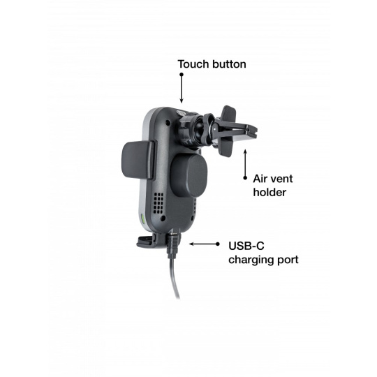 Rychlonabíjecí držák na telefon nabízí snadné použití, bezpečí a praktičnost. Vyberte si, zda držák nainstalujete na ventilační otvor automobilu, nebo jej pomocí přísavky přichytíte na palubní desku nebo čelní sklo. Jakmile telefon umístíte do držáku, postranní raménka jej automaticky sevřou a postarají se o to, že telefon bude na svém místě. Raménka se otevírají stiskem tlačítek po stranách nabíječky. Držák lze otáčet o 360°, což zajišťuje optimální prohlížení a snazší využití funkcí.