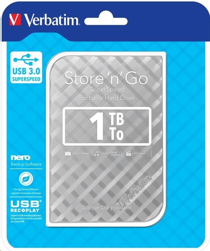 VERBATIM HDD 2.5" 1TB Store 'n' Go Portable Hard Drive USB 3.0, Silver Special Features: Colours available: Black, Silver, White, Red & Blue Capacities available: 500GB, 1TB & 2TB High speed, high capacity storage. A fast & safe solution to expand storage or backup files USB 3.0 SuperSpeed - for ultra fast data transfer Nero Backup Software Energy Saving Software USB REC & PLAY* - supports USB recording/ playback 2 year limited warranty** System requirements: PC or Mac with USB 3.0 Windows XP / Vista / Windows 7 & 8 Mac OS X 10.4 or higher Pack Contents: Portable Hard Drive / USB 3.0 Cable / Nero Backup Software / Green Button Energy Saving Software / Verbatim Formatter / Quick Start Guide / User Guide (pre-loaded on the drive).