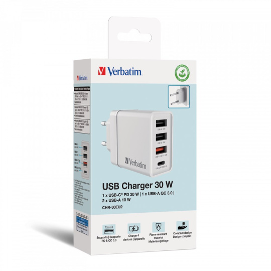 VERBATIM Univerzální adaptér nabíječka CHR-30EU2, 30W, 1x USB-C, 3x USB bílá