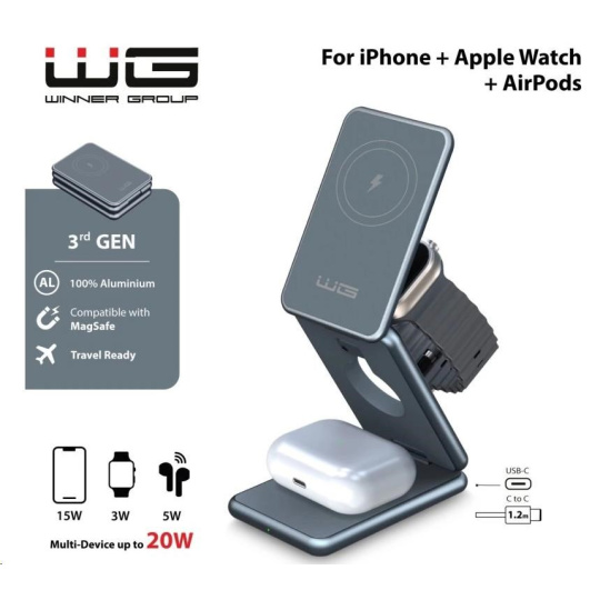 WG - Bezdrátová nabíječka WG39, 3v1, 15W+5W+3W, šedá