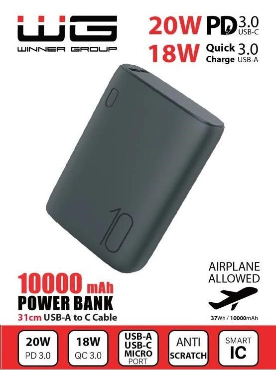 WG - Power Bank 10000 mAh, QC 3.0 a PD output+input, ultra malá, černá