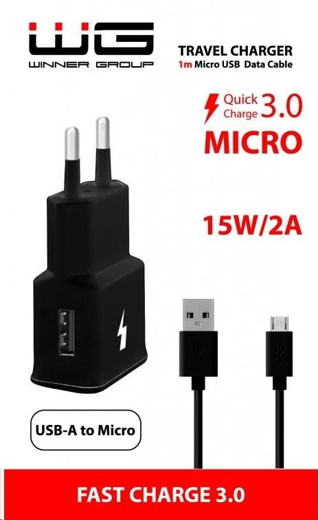 WG - Síťová nabíječka 1x USB-A, Quick Charge 3.0, 5V-9V-12V + kabel USB-A na Micro USB, black