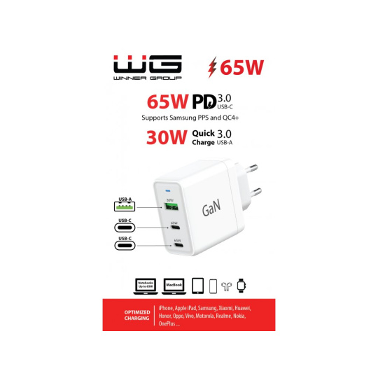 WG - Síťová nabíječka GaN 3x USB, 1x USB-A 30W + 2x USB-C 65W, bílá