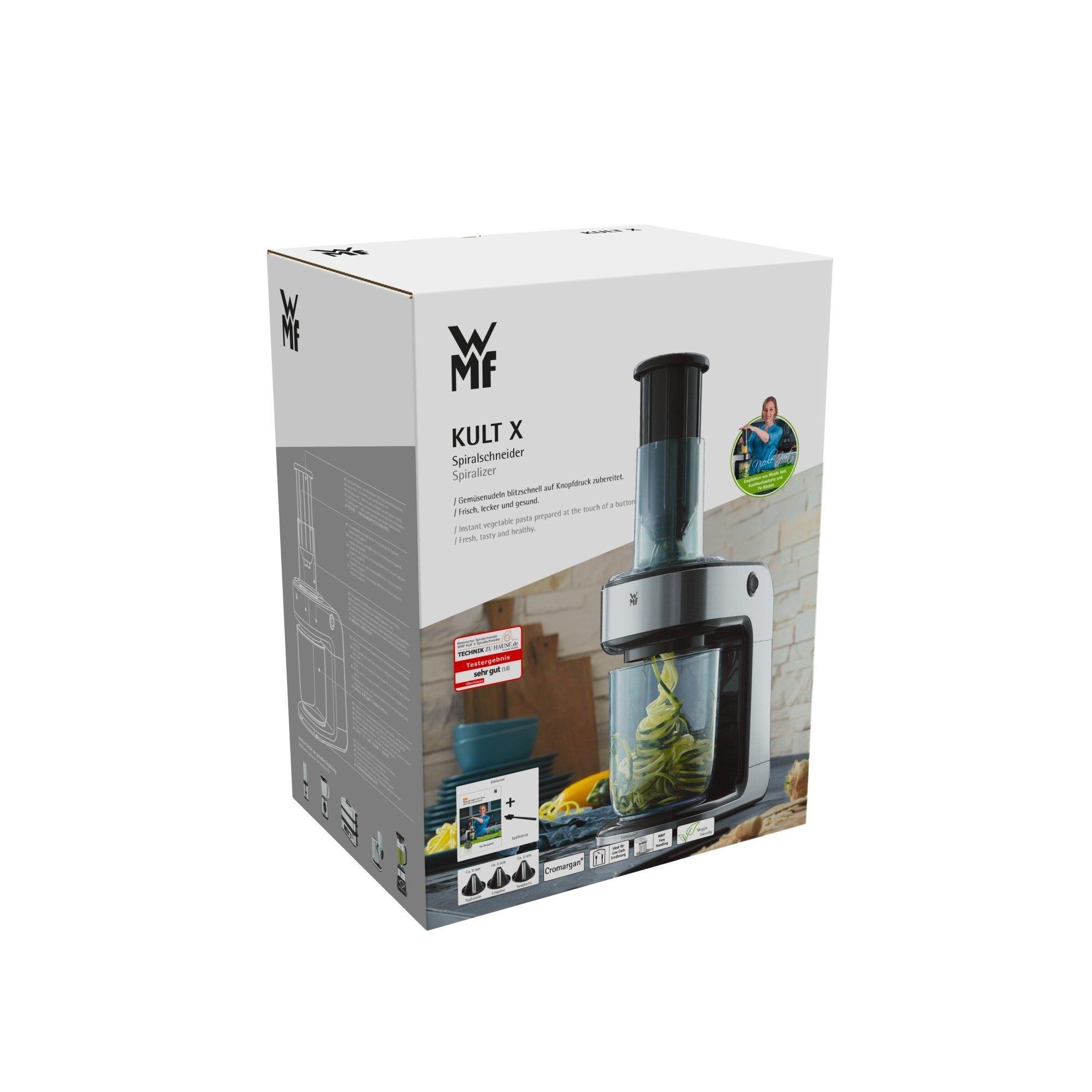 První elektrický spiralizér: v mžiku hotové zeleninové těstoviny stisknutím jednoho tlačítka. Spiralizér WMF Kult X se dokonale hodí na nízkosacharidové diety a zdravé stravování. Jako náhradu běžných těstovin, první elektrický spiralizér svého druhu nakrájí tvrdé ovoce a zeleninu na barevné a dekorativní spirálky mrknutím oka.