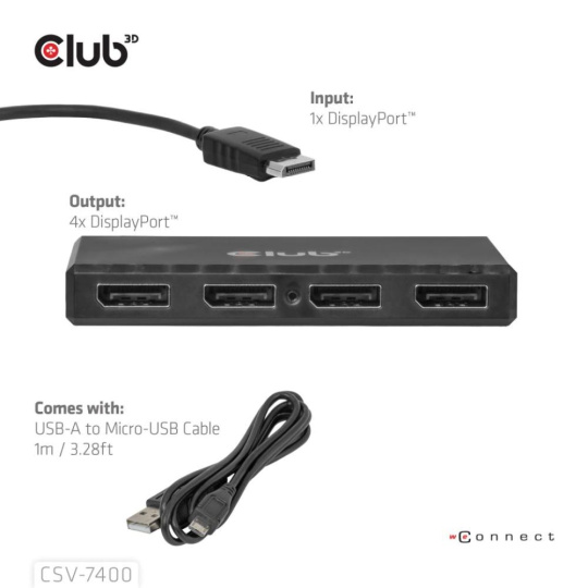 Club 3D CSV-7400 ti umožní připojit až čtyři displeje z jednoho DisplayPort zdroje. Podporuje současný výstup čtyř obrazovek v rozlišení 4K při 30 Hz, díky čemuž je ideálním řešením pro multitasking, vyšší produktivitu nebo rozšířený pracovní prostor.