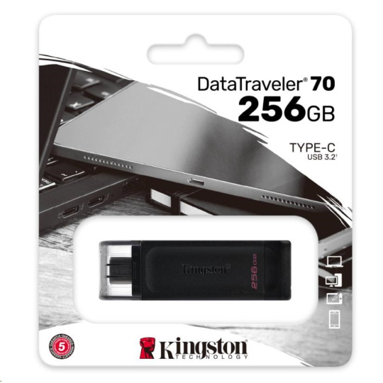 Kingston’s DataTraveler 70® is a USB 3.2 Gen 1 compliant portable, lightweight USB-C1 flash drive. It’s designed to be used with compatible USB-C devices such as notebooks, laptops, tablets and phones. With capacities of up to 256GB2, the DataTraveler 70 is more than capable of expanding your storage for everyday use. It comes backed with a 5-year warranty and free tech support.