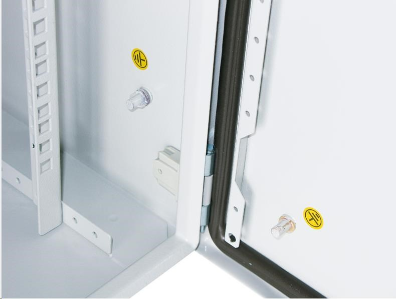 Venkovní nástěnný rozvaděč vyrobený z válcované oceli o tloušťce 1,5 mm. Třívrstvá povrchová úprava. Provedení: dveře - plné, otevíratelné o 110°, zaměnitelný směr otevírání, těsnění z pěnového polyuretanu zádní kryt - plný boční kryt - plný horní kryt - plný